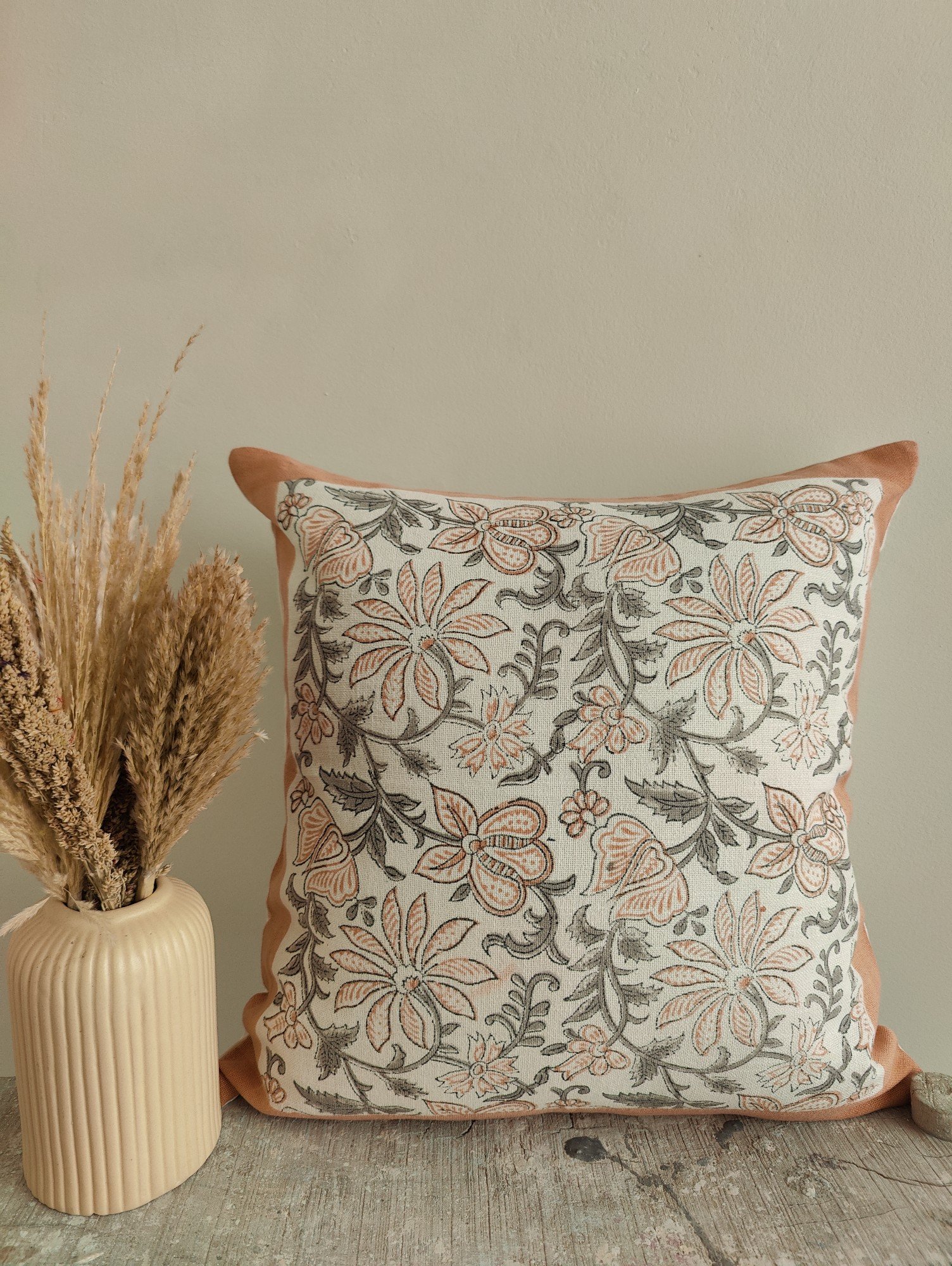 Floral hand block printed cotton slub cushion cover with beige, brown and charcoal botanical design, square 18x18 pillow cover